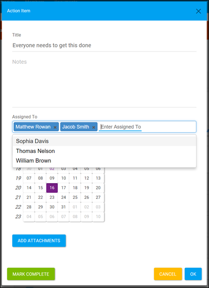 A highly request feature you can now assign an action to multiple members. Each on will get an email about the assigned action. The input works with type-ahead to prefill, or you can just click and select from the list.