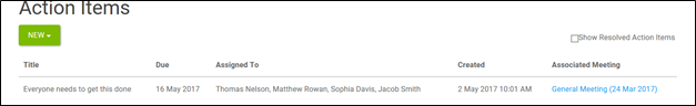 The assignees are displayed inline during the meeting and in the Schedule with the outstanding actions.
