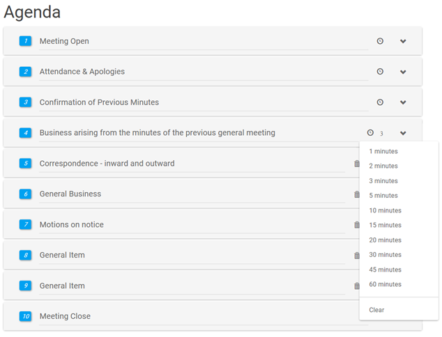 Set the agenda item allotted time by clicking the clock logo and will be seen inline and on the agenda. You can also set this on the agenda templates in settings and have it automatically applied to new meetings.