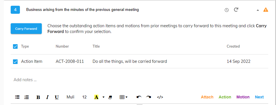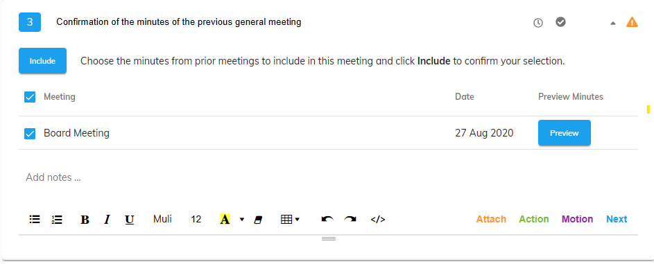 The yellow exclamation mark (!) indicates there is outstanding actions or motions to be carried forward. This feature eliminates the risk of overlooked actions and motions, leading to a more being done and effective decision-making process.