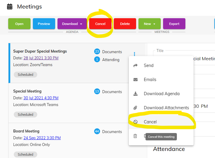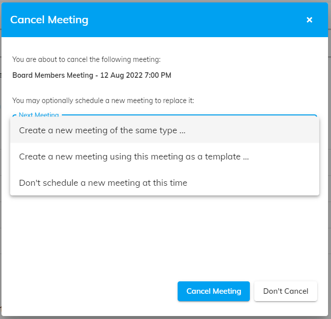 The explicit carry-over and inclusion of previous minutes in the new meeting also has the added benefit of allowing for more efficient and streamlined cancellation of meetings. If a meeting needs to be cancelled, you can simply do so now, not without worrying about previous referenced meetings. You have the same options at that time as the close meeting options. All outstanding actions and motions will remain accessible for future use, eliminating the need for manual reassignment or transfer. This improves clarity and guarantees that all critical items are properly documented and tracked.