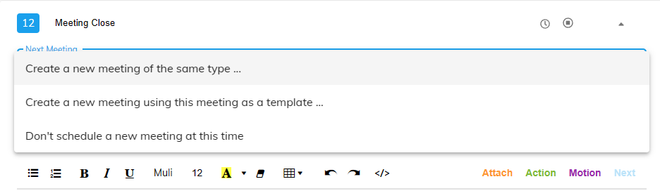 The process of carrying over actions and motions from one meeting to the next has been simplified in Process PA. In the past, you were required to specify the date and time of the next meeting when finalizing the previous meeting. However, this is no longer the case. You can now finalize the current meeting without specifying the next meeting date, providing you with more flexibility. There is a handful of changes that were required to enable this to happen as detailed below.