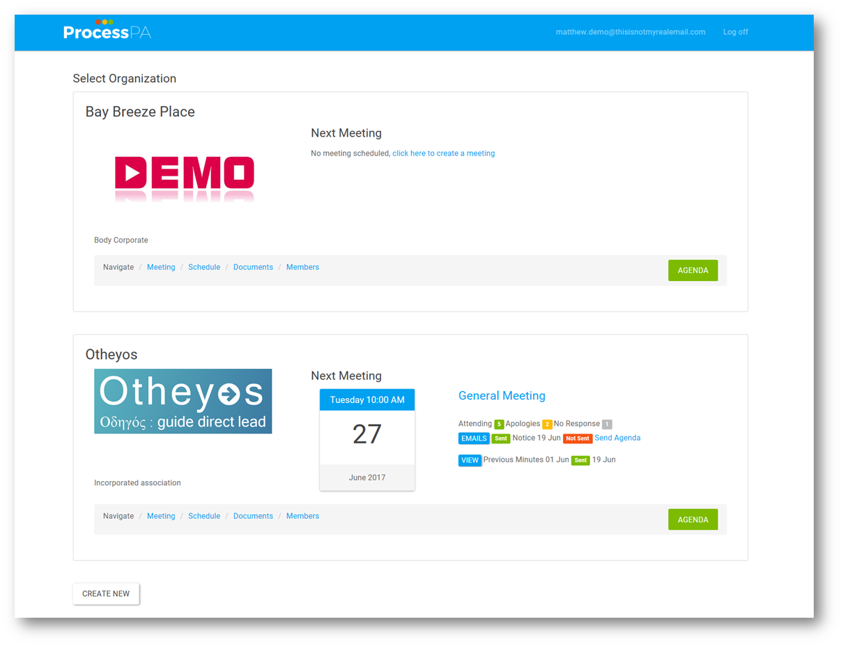 Below you can see Matthew Demo is a member of two organizations, a Body Corporate, Bay Breeze Place which has no upcoming meetings, and Otheyos an Incorporated Association who’s next meeting is 27 June 2017 at 10am.