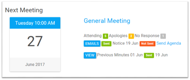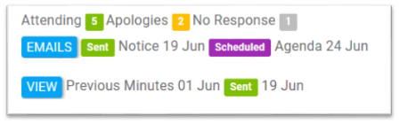 If we look closer at the details you will see that at a glance, the Notice email was sent out on 19 June requesting attendance and 5 have responded attending, 2 apologies and 1 has not yet responded. The Agenda has not yet been sent and a link is provided to quickly jump to the Send Agenda screen. The previous minutes have been emailed and a View button to jump directly to the minutes viewing online is available.
