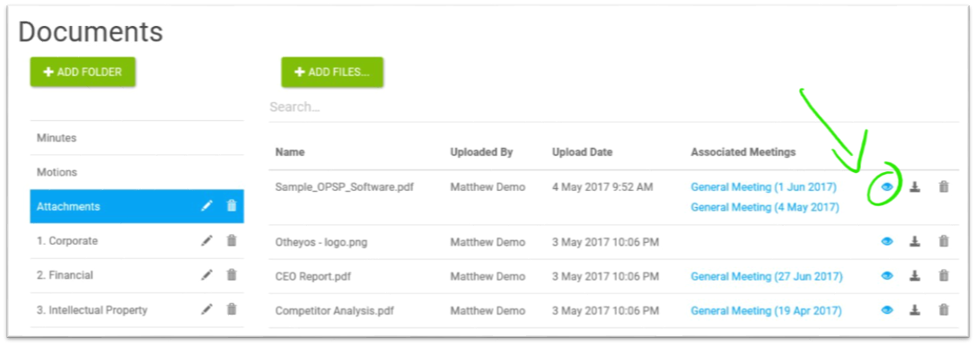 Within Documents you can now preview the files directly in the browser. This works mostly for PDF currently although will depend on your browser and operating system as to what types are viewable. We will continue working to support most file types. The viewing extends to attachments in agenda’s and minutes.