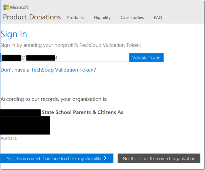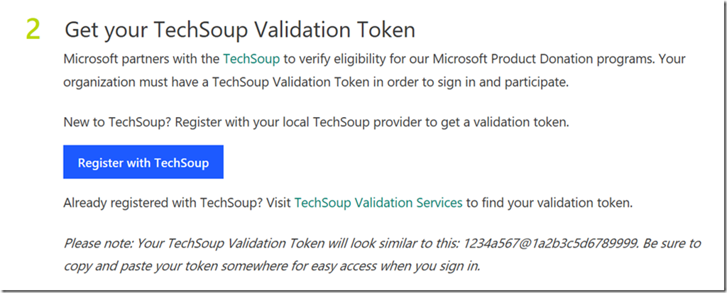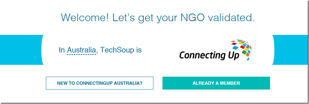 Get your TechSoup Validation Token. This is a process in itself and will take a few days to acquire. Clicking the Register with TechSoup will take you to a page to find out who the register provider is. In Australia, it is Connecting Up. Side Step: Get your TechSoup Validation token small Nonprofit Organizations such as Kindergartens and P&Cs