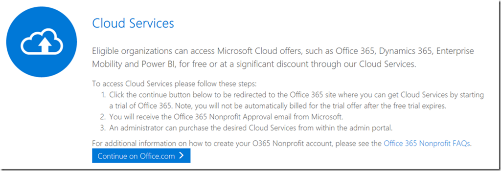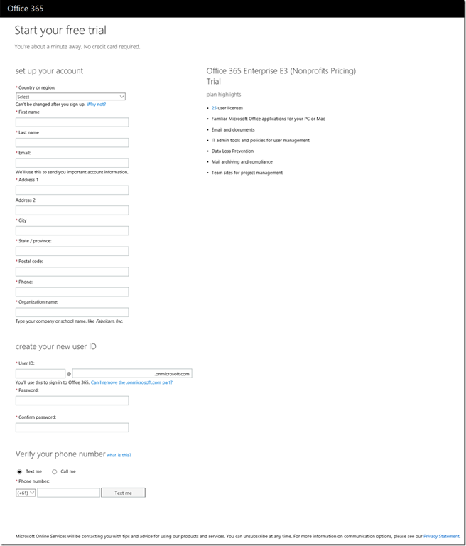 Fill out the Office 365 Registration form. You’ll see that it configures it for Office 365 Enterprise E3 (Nonprofits Pricing) Trial which may not be the subscription you want, but you can change it later.