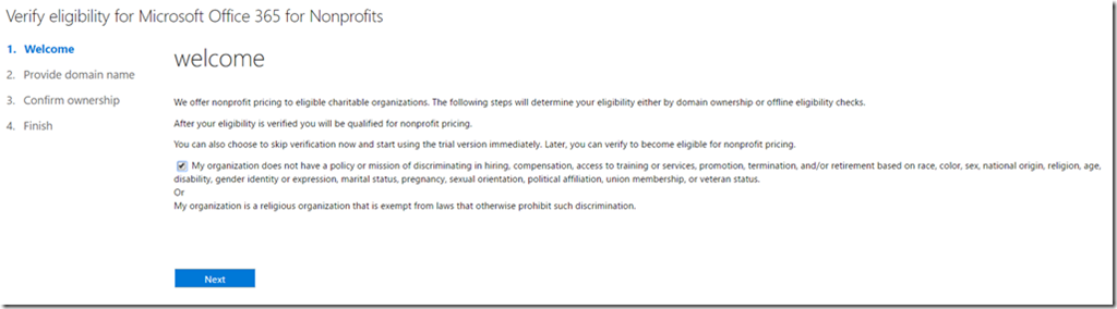 Continue through the setup as guided and you will be taken through the wizard to verify your Nonprofits eligibility again with Microsoft. If you choose to skip the setup for later it can cause delays in the eligibility process.