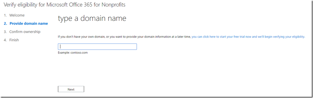 Domain name. Note: If you do not have a domain name you may not need to add one. It will be required however that you raise a support request with Microsoft to validate your Nonprofit pricing eligibility. If you do not have a domain name, you can get one very easily at GoDaddy, Namecheap, Crazy Domains or many other providers.