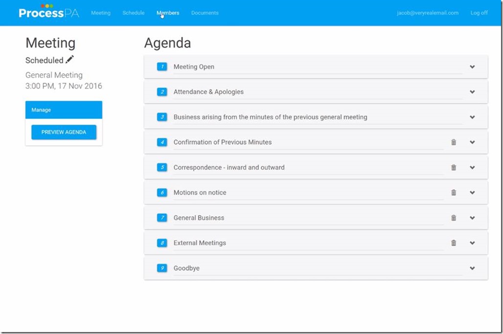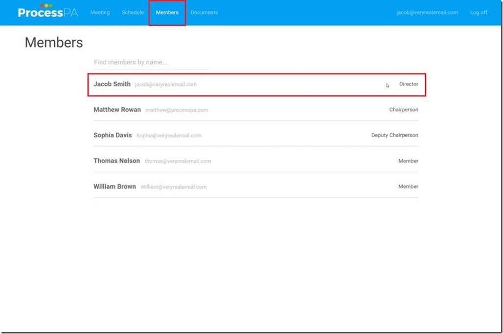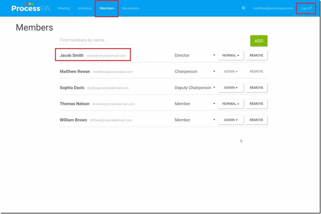 - At the “Members” page, which you can access by clicking the “Members” tab located at the top portion of the screen”, you will see the list of meeting members and their designations. In this guide, we will create an account for “Jacob Smith” as highlighted in red box below. To start off, exit from your current account by clicking on the “Log off” button.