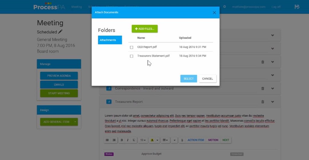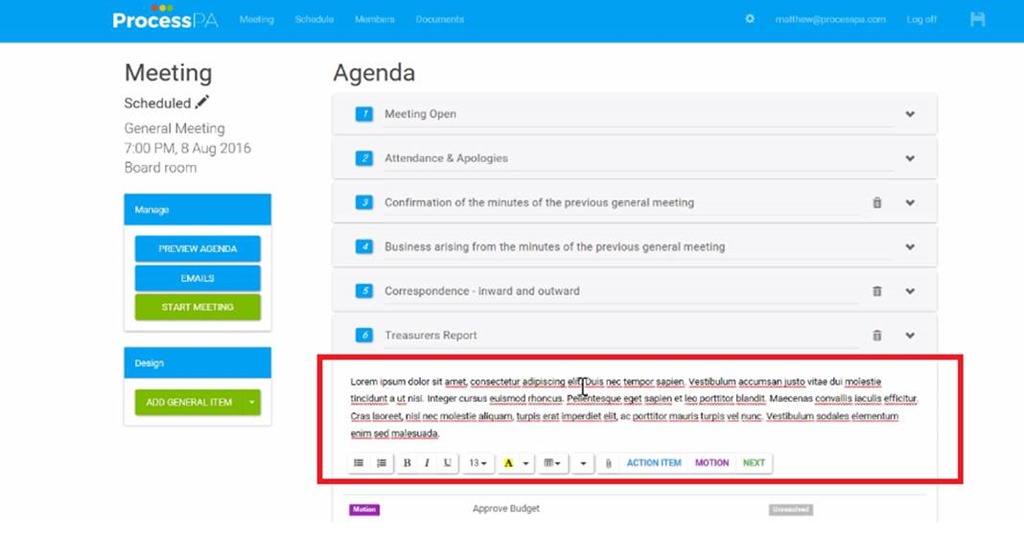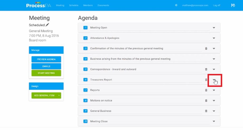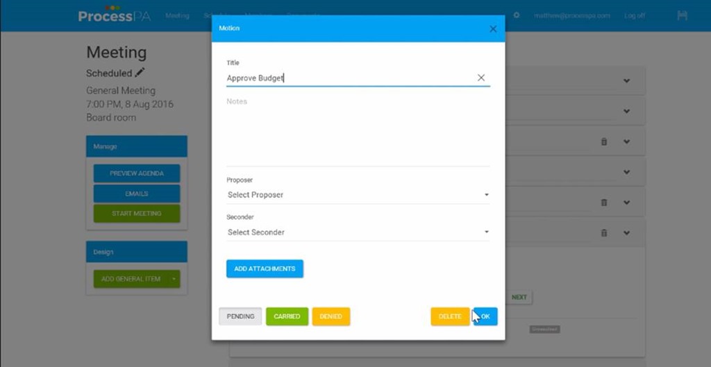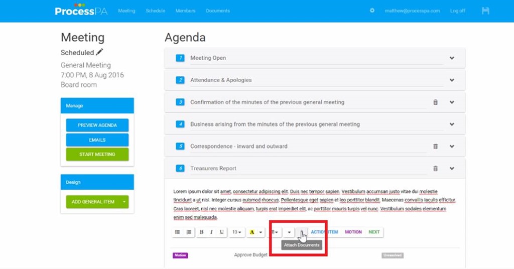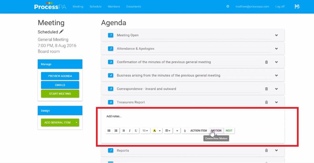 Below shows how to add notes, motions for consideration and attachments to your agenda: