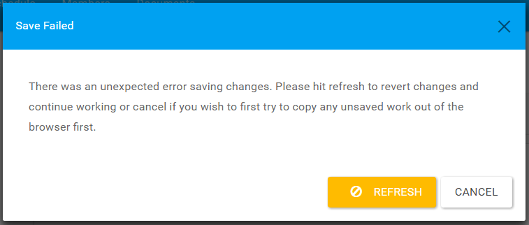 If at anytime the save fails to reach the server, the message below will pop up, warning you. Refresh and try again. If the problem persists please contact support.